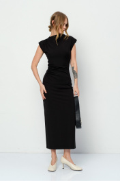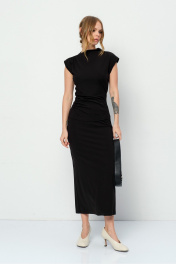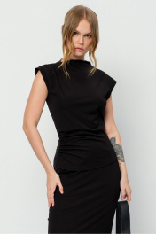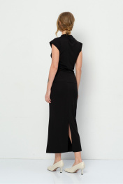 Трикотажный костюм-двойка из облегающей асимметричной блузы и миди-юбки. Детали: прилегающий силуэт, асимметричный крой, фигурный вырез горловины переда и спинки, без застежки. Юбка прямого силуэта, пояс на резинке, спинка с высоким разрезом. Юбка на трикотажной подкладке. Длина блузы по спинке со стойкой около 58 см в размерах 40-46 и около 61 см в размерах 48-52. Длина юбки по боку с поясом около 88 см