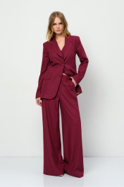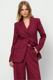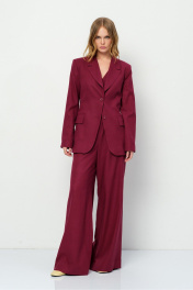 Льняной костюм-двойка из полуприлегающего жакета со шлицами и широких брюк на резинке. Детали: пиджачный воротник, талиевые вытачки, функциональный нагрудный карман, два прорезных кармана с клапанами, застежка на петли и пуговицы, спинка со средним швом и шлицей, рукава втачные двухшовные со шлицами по низу, жакет на хлопковой подкладке. Брюки с высокой посадкой на притачном эластичном поясе, без застежки, боковые карманы. Длина жакета по спинке около 69 см в размерах 40-46 и около 72 см в размерах 48-52, длина рукавов около 62 см. Длина брюк по боковому шву с поясом около 105 см в размерах 40-46 и около 106,5 см в размерах 48-52, длина по внутреннему шву около 78 см