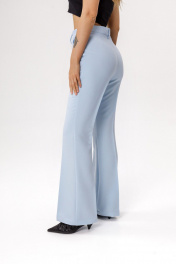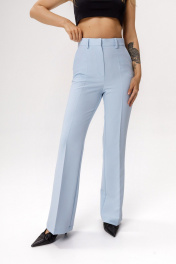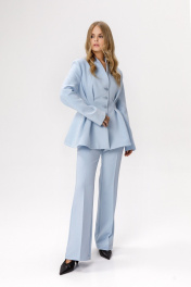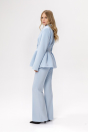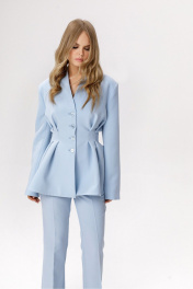 Костюм-двойка из приталенного жакета со складками и брюк-клеш со стрелками. Детали: жакет полуприлегающего силуэта с расширенными плечами, цельнокроеный воротник-стойка, застежка на петли и пуговицы, рукава втачные двушхшовные, жакет на подкладке. Брюки с притачным поясом со шлевками, передние половины с заутюженными стрелками, застежка на молнию и потайные крючки, боковые карманы. Задние части брюк с вытачками и заутюженными стрелками. Пояс брюк без резинки. Длина жакета по спинке около 66 см в размерах 40-46 и около 67,5 см в размерах 48-52, длина рукава около 61 см. Длина брюк по боковому шву с поясом около 112 см в размерах 40-46 и около 115,5 см в размерах 48-52. Длина по внутреннему шву около 82 см