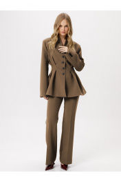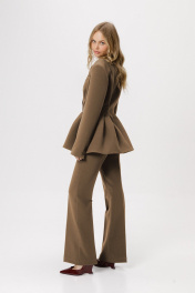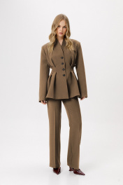 Костюм-двойка из приталенного жакета со складками и брюк-клеш со стрелками. Детали: жакет полуприлегающего силуэта с расширенными плечами, цельнокроеный воротник-стойка, застежка на петли и пуговицы, рукава втачные двушхшовные, жакет на подкладке. Брюки с притачным поясом со шлевками, передние половины с заутюженными стрелками, застежка на молнию и потайные крючки, боковые карманы. Задние части брюк с вытачками и заутюженными стрелками. Пояс брюк без резинки. Длина жакета по спинке около 66 см в размерах 40-46 и около 67,5 см в размерах 48-52, длина рукава около 61 см. Длина брюк по боковому шву с поясом около 112 см в размерах 40-46 и около 115,5 см в размерах 48-52. Длина по внутреннему шву около 82 см