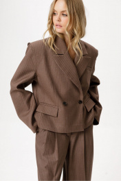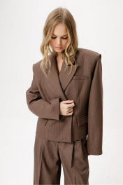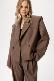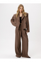 Костюм-двойка из укороченного оверсайз жакета с необработанным краем пройм и широких брюк-палаццо из текстильной ткани в полоску. Детали: жакет прямого силуэта, пиджачный воротник, двубортная застежка на две петли и пуговицы, функциональные карманы, спинка с фигурной кокеткой, рукава втачные, жакет на подкладке. Брюки с притачным поясом со шлевками, складки у пояса, застежка на молнию и пуговицу, боковые карманы, заутюженные стрелки. Задние части брюк с вытачками и имитацией карманов. Длина жакета по спинке около 55 см в размерах 40-46 и около 56,5 см в размерах 48-52, длина рукавов около 61 см. Длина брюк по боковому шву с поясом около 109,5 см, длина по внутреннему шву около 83 см