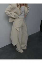 Широкие брюки-палаццо в полоску. Детали: брюки с притачным поясом со шлевками, складки у пояса, застежка на молнию и пуговицу, боковые карманы, заутюженные стрелки. Задние части брюк с вытачками и имитацией карманов. Длина по боковому шву с поясом около 109,5 см, длина по внутреннему шву около 83 см. Приобрести жакет с фото можно по арт. 6377, пояс-баску по арт.6379