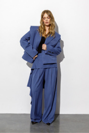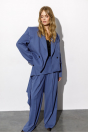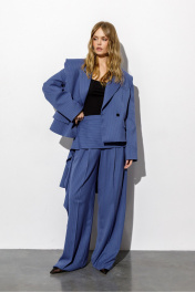 Широкие брюки-палаццо в полоску. Детали: брюки с притачным поясом со шлевками, складки у пояса, застежка на молнию и пуговицу, боковые карманы, заутюженные стрелки. Задние части брюк с вытачками и имитацией карманов. Длина по боковому шву с поясом около 109,5 см, длина по внутреннему шву около 83 см. Приобрести жакет с фото можно по арт. 6377, пояс-баску по арт.6379