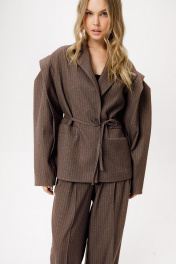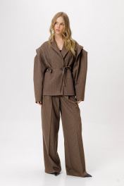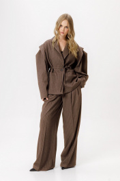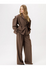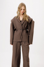 Костюм-двойка из оверсайз жакет со съёмным поясом и широких брюк-палаццо из текстильной ткани в полоску. Детали: жакет прямого силуэта, удлинённая линия плеча, втачной одношовный рукав с ассиметричными складками, функциональные карманы, центральная застёжка на петлю и пуговицу, жакет на подкладке. Брюки с притачным поясом со шлевками, складки у пояса, застежка на молнию и пуговицу, боковые карманы, заутюженные стрелки. Задние части брюк с вытачками и имитацией карманов. Длина жакета по спинке в размерах 40-46 около 67 см, в размерах 48-52 около 70 см, длина рукава около 61 см. Длина брюк по боковому шву с поясом около 109,5 см, длина по внутреннему шву около 83 см