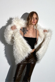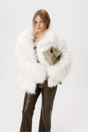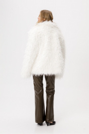 Шуба свободного покроя из длинноворсового меха под ламу. Детали: прямой, силуэт, отложной воротник, рукава втачные длинные, застежка на пришивные крючки. Шуба утепленная, наполнитель ISOSOFT толщиной 150 г/м2. Длина по спинке около 67 см. Длина рукава около 63 см