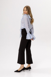 Укороченные брюки-клёш со стрелками (приобрести блузу с фото можно по арт. 6561). Детали: брюки клёш с притачным поясом со шлёвками, наклонные карманы в боковых швах, застёжка на молнию и крючок, талиевые вытачки на передних и задних половинках брюк. Длина по боковому шву с поясом около 96 см в размерах 40-46 и около 98 см в размерах 48-52. Длина по внутреннему шву около 67 см