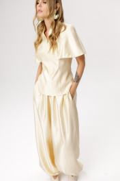 Блуза приталенного силуэта и цельнокроеной пелериной (приобрести брюки с фото можно по арт. 6671). Детали: прилегающий силуэт, талиевые вытачки по переду и спинке, цельнокроеная горловина стойка, потайная молния в среднем шве спинки, блуза на подкладке. Длина блузы по спинке около 62 см в размерах 40-46, около 65 см в 48-52.