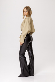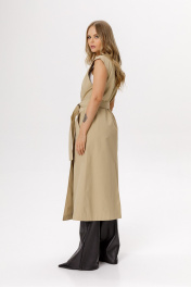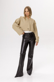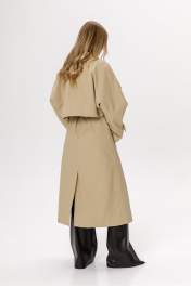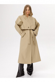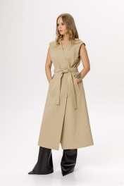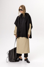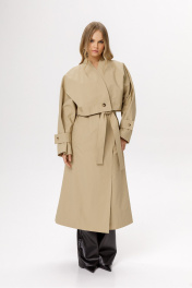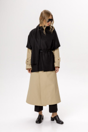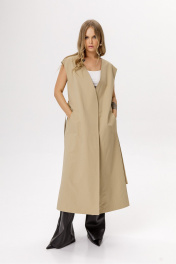 Свободный универсальный тренч-трансформер состоящий из жилета и верхней укороченной куртки. Детали: жилет прямого силуэта и свободного покроя, V- образный вырез горловины переда, без застежки, шлевки и съемный пояс, жилет на подкладке. Верхняя укороченная куртка свободного силуэта с цельнокроеными рукавами, воротник- стойка с вытачками, рукава длинные с патами, застежка по переду на одну петлю и пуговицу, спинка со средним швом, на подкладке. Тренч-трансформер позволяет создавать разные образы в зависимости от погоды и случая. Длина жилета по спинке около 118 см в размерах 40-52. Длина куртки по спинке около 40 см в размерах 40-46 и около 42 см в размерах 48-52 см. Длина рукава с плечом около 73 см.
