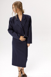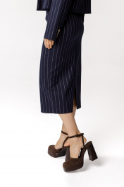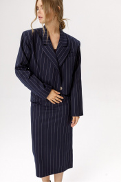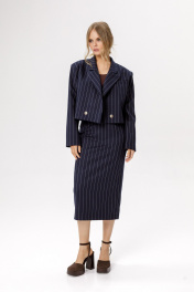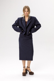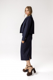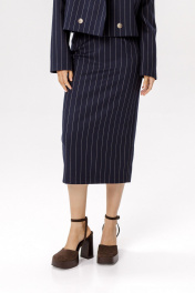 Юбки миди из текстильной ткани в полоску с разрезом сзади (приобрести жакет с фото можно по арт. 6627). Детали: юбка прямого силуэта, длина до середины икры, притачной пояс, талиевые вытачки на переднем и заднем полотнище, потайная молния в среднем шве спинки, юбка на подкладке. Длина по боковому шву с поясом около 79 см в размерах 40-46, около 81 см в размерах 48-52.