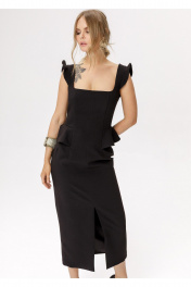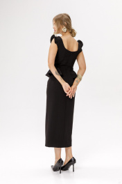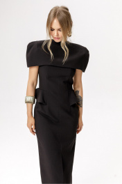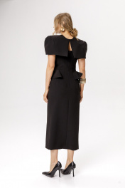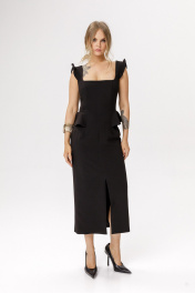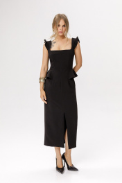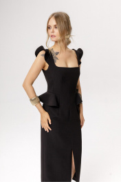 Приталенное миди-платье с глубоким вырезом и отлетными деталями по талии (приобрести кейп с фото можно по арт. 6640). Детали: прилегающий силуэт, кареобразный вырез горловины переда и спинки, отрезная линия талии, рельефные швы, потайная застежка по спинке, на подкладке. Длина по спинке от плеча около 123 см