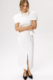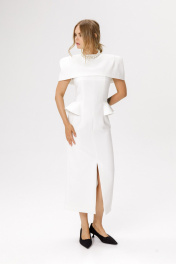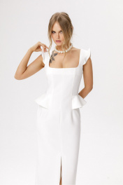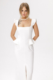 Приталенное миди-платье с глубоким вырезом и отлетными деталями по талии (приобрести кейп с фото можно по арт. 6640). Детали: прилегающий силуэт, кареобразный вырез горловины переда и спинки, отрезная линия талии, рельефные швы, потайная застежка по спинке, на подкладке. Длина по спинке от плеча около 123 см