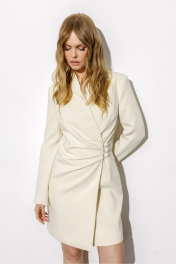 Асимметричное приталенное мини-платье. Детали: полуприлегающий силуэт, перед с асимметричными складками, воротник с цельнокроенной стойкой, спинка со средним швом и талиевыми вытачками, рукава втачные двухшовные с имитацией шлицы и декоративными пуговицами, платье застёгивается на три навесные петли и пуговицы по переду. Длина по спинке в размерах 40-46 около 86 см, в размерах 48-52 около 89 см, длина рукава около 62 см