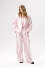 Широкие брюки-палаццо (приобрести жакет с фото можно по арт. 6659, приобрести жилет с фото можно по арт. 6660, приобрести баску с фото можно по арт. 6551). Детали: брюки с притачным поясом со шлевками, складки у пояса, застежка на молнию и пуговицу, боковые карманы, заутюженные стрелки. Задние части брюк с вытачками и имитацией карманов. Длина брюк по боковому шву с поясом около 109,5 см, длина по внутреннему шву около 83 см