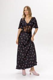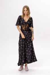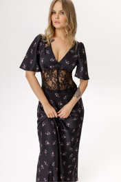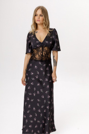 Платье-комбинация длины макси с кружевным широким поясом. Детали: прилегающий силуэт, глубокий V-образный вырез, завышенная фигурная линия талии, лиф со сборкой, потайная молния в боковом шве, короткие рукава со сборкой по окату, лиф и юбка платья на подкладке 100% вискоза, декоративные пуговицы по переду. Длина по спинке около 140 см. Длина рукава около 30 см