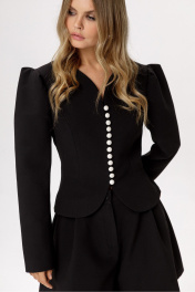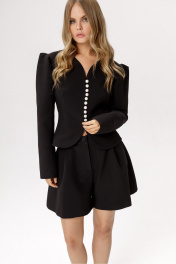 Мини-шорты из текстильной ткани (приобрести жакет с фото можно по арт. 6664). Детали: широкие расклешённые шорты, складки по передним половинкам, притачной пояс, застёжка на молнию и пуговицу, карманы в боковых швах. Длина по боковому шву с поясом около 43 см в размерах 40-46 и около 47 см в размерах 48-52 см. Длина по внутреннему шву около 12 см в размерах 40-46, около 15 см в размерах 48-52