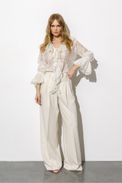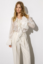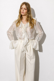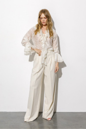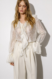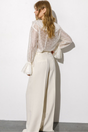 Полупрозрачная блуза из вискозы с воланами и вышивкой (приобрести брюки с фото можно по арт. 6378). Детали: блуза прямого силуэта, V-образный вырез горловины, воротник-волан, низ рукавов на эластичной тесьме с воланами, завязки по переду. Длина по спинке около 61 см в размерах 40-46, 64 см в размерах 48-52, длина рукава с воланом около 60 см