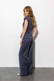 Широкие прямые брюки (приобрести жилет с фото можно по арт. 6698). Детали: брюки с притачным поясом со шлевками, передние половины с небольшими застроченными мягкими складками и заутюженными стрелками, застежка на молнию и пуговицу, боковые карманы. Задние части с вытачками и заутюженными стрелками. Пояс прямой, без резинки. Длина по боковому шву с поясом около 114 см в размерах 40-46 и около 115,5 см в размерах 48-52. Длина по внутреннему шву около 83 см