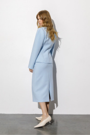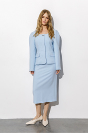 Приталенный жакет с круглым вырезом из текстильной ткани (приобрести юбку с фото можно по арт. 6528, брюки по арт. 6726). Детали: прилегающий силуэт, талиевые вытачки и рельефы по переду, спинка со средним швом и талиевыми вытачками, втачной фигурный рукав с верхним швом, функциональные карманы с клапанами, центральная потайная застёжка с верхней декоративной пуговицей, жакет на подкладке. Длина жакета по спинке около 58 см в размерах 40-46 и около 61 см в размерах 48-52, длина рукава около 62 см.