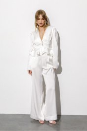 Атласная блуза с воланами и глубоким вырезом (приобрести брюки с фото можно по арт. 6705). Детали: блуза приталенного силуэта, глубокий V-образный вырез переда с застежкой на навесные петли и пуговицы, пояс-кокетка с воланами, длинные рукава со сборкой по окату, фигурный низ, подкладка- 100% вискоза. Длина по спинке около 50 см в размерах 40-46 и около 52,5 см в размерах 48-52, длина рукава около 63 см