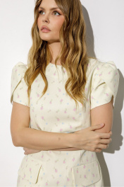 Мини-платье с рукавом «фонариком» из принтованной ткани. Детали: полуприлегающий силуэт, отрезное по линии талии, перед с талиевыми вытачками, функциональные карманы с фигурными клапанами, спинка со средним швом и талиевыми вытачками, рукава втачные с запахом и бантовыми складками, застёжка на потайную молнию в среднем шве спинки, платье на подкладке. Длина платья по спинке около 84 см в размерах 40-46 и около 88 см в размерах 48-52, длина рукава около 19,5 см