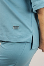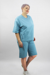 Комплект, второго слоя одежды, состоящий из джемпера и шорт. Джемпер второго слоя одежды, прямого силуэта с коротким втачным рукавом. Спинка удлиненная, боковые швы заканчиваются разрезами. V-образный вырез горловины обработан двойной притачной бейкой. Низ стана и рукава подогнут на спецмашине 3,5 см. Отделка - декоративная силиконовая нашивка. Шорты c боковым швом, верх подогнут на спецмашине с прокладыванием ластичной тесьмы 3,0 см. Низ подогнут на спецмашине 3,5 см.