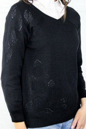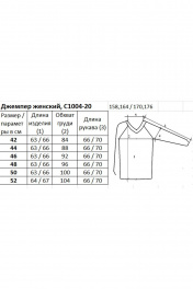 Джемпер женский,второго слоя одежды,прямого силуэта с длинным рукавом реглан. V-образный вырез горловины переда и спинки обработан прикеттлеваной бейкой ластик 2х2 выс. в г.в. 3,2+- 0,3 см. На спинке вывязано отверстие длиной 8,0+-0,5 см. Заработок стана и рукава - ластик 2х2 высотой 4,0+-0,5 см. По низу заработка стана и рукавов, а также краю бейки проложена пряжа высокорастяжимая