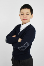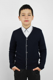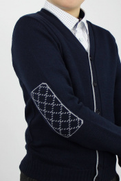 Изделие второго слоя одежды .Притачная бейка высотой 2,5см. По краю бейки проложена полоска контрастного цвета.На рукаве вывязан рисунок (интарсия ). Количество пуговиц 5+1