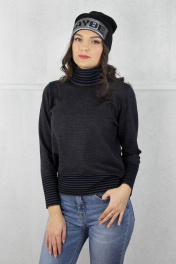 Свитер женский,второго слоя одежды,регулярный,полуприлегающего силуэта с длинным втачным рукавом. Круглый вырез горловины обработан высоким ластичным воротником-ластик1х1 высотой в готовом виде 16см+-1,0см в том числе сдвоенная кулирная гладь 1,0 см+-0,2см. Низ стана и рукавов заработан ластиком 1х1
