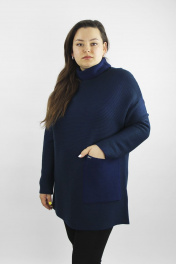 Свитер женский, второго слоя одежды, удлиненный, немного заужен книзу. Рукав рубашечный, со спущенной линией плеча. Воротник притачной отложной, по ростку проложена отделочная строчка. На переде накладной карман изнанкой на лицо.На кармане отделка - декоративное металлическое украшение.
