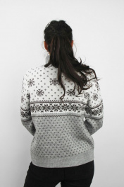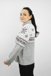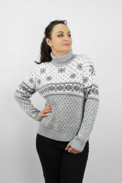 Свитер женский второго слоя одежды, регулярный, прямого силуэта. Рукав втачной длинный. Круглый вырез горловины обработан отложным воротником выс. в гот. виде 15,5+-0,8 см.