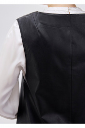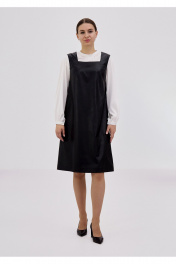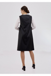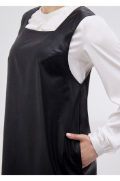 Сарафан женский из искусственной кожи на вискозной мягкой основе. Силуэт прямой длины чуть ниже колена. Вырез горловины "каре". Нагрудный вытачки из проймы. Спинка со средним шов и плечевой вытачкой. Есть карманы в боковых швах. Без застежек.