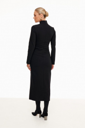 Длинное платье прилегающего силуэта, рукава одношовные длинные, подрез переда заканчивается разрезом, горловина со стойкой, в среднем шве спинки потайная застежка-«молния».