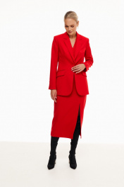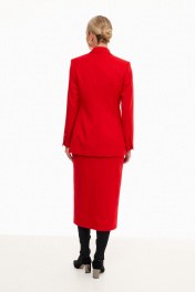 Жакет прилегающего силуэта, на подкладке, удлинённый, с центральной застежкой на петлю и пуговицу, с рельефами по переду и спинке, на подкладке. На деталях переда обработаны наклонные прорезные карманы с клапанами и двумя обтачками. Спинка со средним швом и рельефами. Рукава втачные, двухшовные.