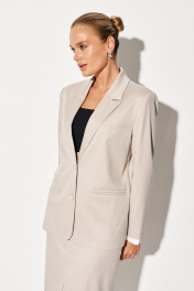 Комплект женский. Жакет прямого силуэта, на подкладке, с расширенной линией плеча, с застежкой на петли и пуговицы, воротником пиджачного типа. На деталях переда прорезные карманы в рамку с двумя обтачками. Рукава двухшовные. Юбка прямая, на подкладке, длиной ниже линии колена, с притачным поясом, застежкой на молнию и крючок, по переднему полотнищу закругленные карманы в области боковых швов, средний шов заканчивается шлицей