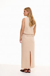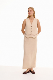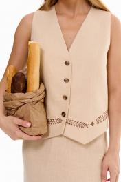 Жилет прямого силуэта, с V- образной горловиной, застежкой на 5 петель и 5 пуговиц, рельефами по переду и спинке. По низу переда и спинки авторская вышивка. Юбка прямого силуэта, с притачным поясом, на подкладке, застежкой на потайную тесьму-«молнию» и разрезом в среднем шве заднего полотнища.