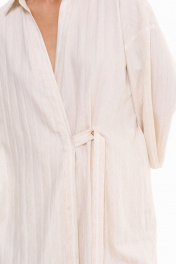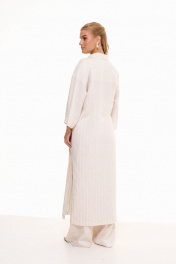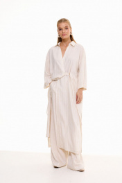 Туника прямого силуэта,со смещеной бортовой застежкой ,фиксирующейся декоративным элементом на пуговице .Воротник стояче-отложного типа ,переходящий в планку борта . Спущеная линия плеча ,рукав одношовный ,средней длины . Спинка с кокеткой ,разрезы по бокоым швам . Брюки прямые, пояс на резинке