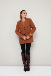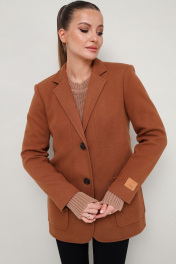 Стильный жакет полуприлегающего силуэта, выполнен из костюмной ткани. Воротник пиджачного типа с отложными лацканами. Застежка центральная на петли и пуговицы. Спереди обработаны накладные карманы, в области груди подрезы с нагрудными вытачками. Спинка с рельефами и средним швом, переходящим в шлицу. Рукава втачные двухшовные, на левом рукаве декоративная нашивка. Изделие на подкладке.