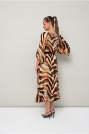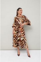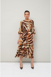 Платье отрезное по линии талии на резинке, выполнено из вискозы с абстрактным принтом. Горловина с окантованным вырезом круглой формы. Рукава-реглан, в длине 3/4 собраны на резинку по низу. По спинке обработан разрез с застежкой в среднем шве на навесную петлю и пуговицу. В комплекте прилагается съемный ремень.