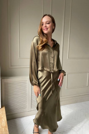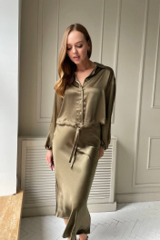 Комплект: блузка и юбка. Юбка полуприлегающего силуэта, расширенная к низу. Блузка укороченная, снизу регулируется шнурком, застегивается на пуговицы спереди. Материал средней плотности, как атлас, гладкий, струящийся. Юбка застегивается на потайную молнию. Блузка: 41 см длина, рукав 55 см, ог 112/116/120/124 см. Юбка 90 см длина, талия 68/72/76/80 см