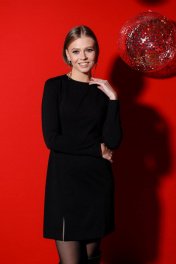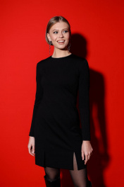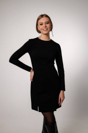 Лаконичное короткое платье из плотного эластичного трикотажа, которое при всей своей простоте не лишено изящества, засчет декоративной обработки горловины в виде страз, также неглубокими разрезами по низу. Изделие отрезное по линии талии, силуэт полуприлегающий. На горловине стразы зашиты в полупрозрачную сеточку, которая их крепит вместе, что позволит стирать изделие в машинке и не волноваться за целостность страз.