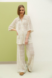 Костюм женский состоящий из блузы и брюк. Блуза свободного силуэта с центральной застежкой на петли пуговицы. Рукав цельнокроеный широкий, длиной от горловины 51 см. Воротник стояче-отложной. По боковым швам расположены 2 разреза. Брюки свободного силуэта, широкие без бокового шва. Верх брюк на подкладке с цельнокроеным поясом на резинке. Длина изделия – 79 см, длина брюк по боку – 120 см .