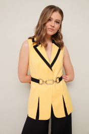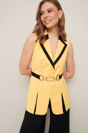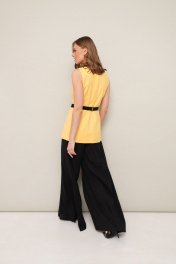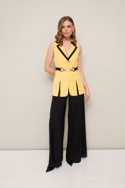 Элегантный комплект, состоящий из жилета и брюк палаццо. Жилет полуприлегающего силуэта на х/б подкладке с воротником пиджачного типа с контрастной окантовкой. Центральная застежка на потайные кнопки. Перед с рельефами, переходящими в разрезы в нижней части жилета. Струящиеся брюки-палаццо свободного силуэта с расклешением от бедра, на притачном поясе, с застёжкой на потайную молнию в боковом шве. Брюки на частичной подкладке. В комплекте прилагается акцентный пояс на резинке с застежкой на кнопки.