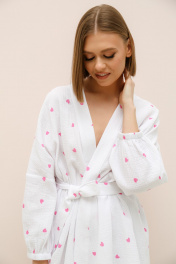 Костюм состоящий из блузы и шорт. Блуза свободного силуэта без застёжки на запах со съемным поясом. Перёд и горловина на притачной планке. Спинка без среднего шва. Рукав втачной одношовный со спущенным плечевым швом на резинке по низу. Шорты свободного силуэта на притачном поясе с резинкой. В боковых швах расположены два боковых кармана. Длина изделия – 78 см, длина рукава – 29 см.