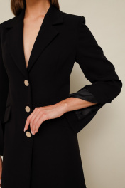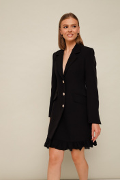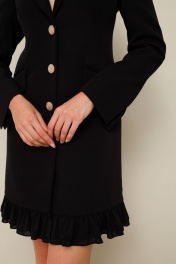 Стильное платье полуприлегающего силуэта, выполнено из костюмно-плательной ткани. Застёжка центральная на петли и пуговицы, внутри платье фиксируется на потайную пуговицу. Воротник пиджачного типа с отложными лацканами. Перед платья с рельефами и наклонными карманами с клапанами в рамку. Рукава втачные с высокими шлицами по низу. Низ платья с оборкой в 2 ряда из отделочной ткани. Спинка с рельефами и средним швом. Изделие на подкладке.