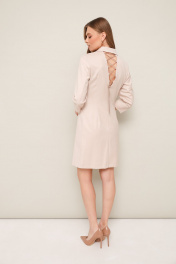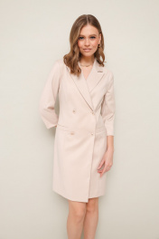 Платье-пиджак с двубортной застёжкой на петли и пуговицы, спереди обработаны карманы с листочками. Воротник пиджачного типа с отложными лацканами. Спинка с V-образным вырезом, который зашнурован акцентной декоративной тесьмой. Рукава втачные, длина 3/4. Изделие на подкладке.