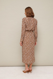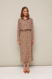 Комплект 2-предметный, состоящий из блузки и юбки на запах. Блузка прямого кроя, горловина обработана воротником на стойке, застежка на притачной планке на петли и пуговицы. Перед блузки с накладными карманами с клапанами. Рукава длинные с притачной манжетой с застежкой на пуговицы. В боковых швах обработаны разрезы. Юбка на запах в длине миди. Притачной пояс с застежкой на полукольца, внутри фиксируется на пришивные кнопки.