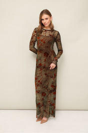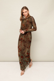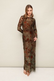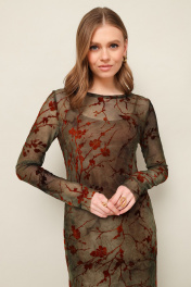 Платье в длине миди прилегающего силуэта, выполнено из сетки с актуальным анималистичным принтом. Округлый вырез горловины. Рукава длинные втачные. Особенностью обработки является открытый срез низа и рукавов. В комплекте прилагается нижнее платье-комбинация на бретельках с регуляторами из эластичного полотна «масло».