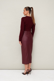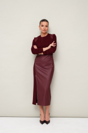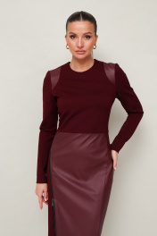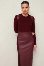 Стильное платье прилегающего силуэта, отрезное по линии талии, выполнено из экокожи и трикотажного полотна. Горловина округлой формы. Длинные втачные рукава. Юбка спереди с подрезом на металлическую молнию, с возможностью регулировать высоту разреза. Застёжка по спинке в среднем шве на потайную молнию.