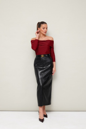 Блуза с открытыми плечами прилегающего силуэта, выполнен из эластичного полотна - бифлекс. По верхнему срезу обработан широкий отворот. Рукава втачные длинные.