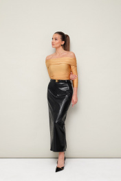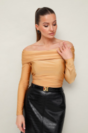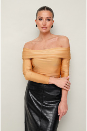 Блуза с открытыми плечами прилегающего силуэта, выполнен из эластичного полотна - бифлекс. По верхнему срезу обработан широкий отворот. Рукава втачные длинные.